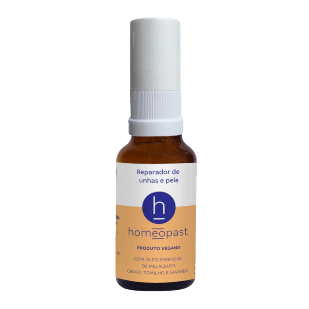 homeopast SPRAY REPARADOR: UNHAS E PELE 30ml – Solução em spray com ação regeneradora que repara os tecidos danificados das unhas, pele e cutículas. Fortalece unhas fracas e quebradiças e controla a oleosidade da pele através das vitaminas, antioxidantes e óleos essenciais de sua formulação. VEGANO.